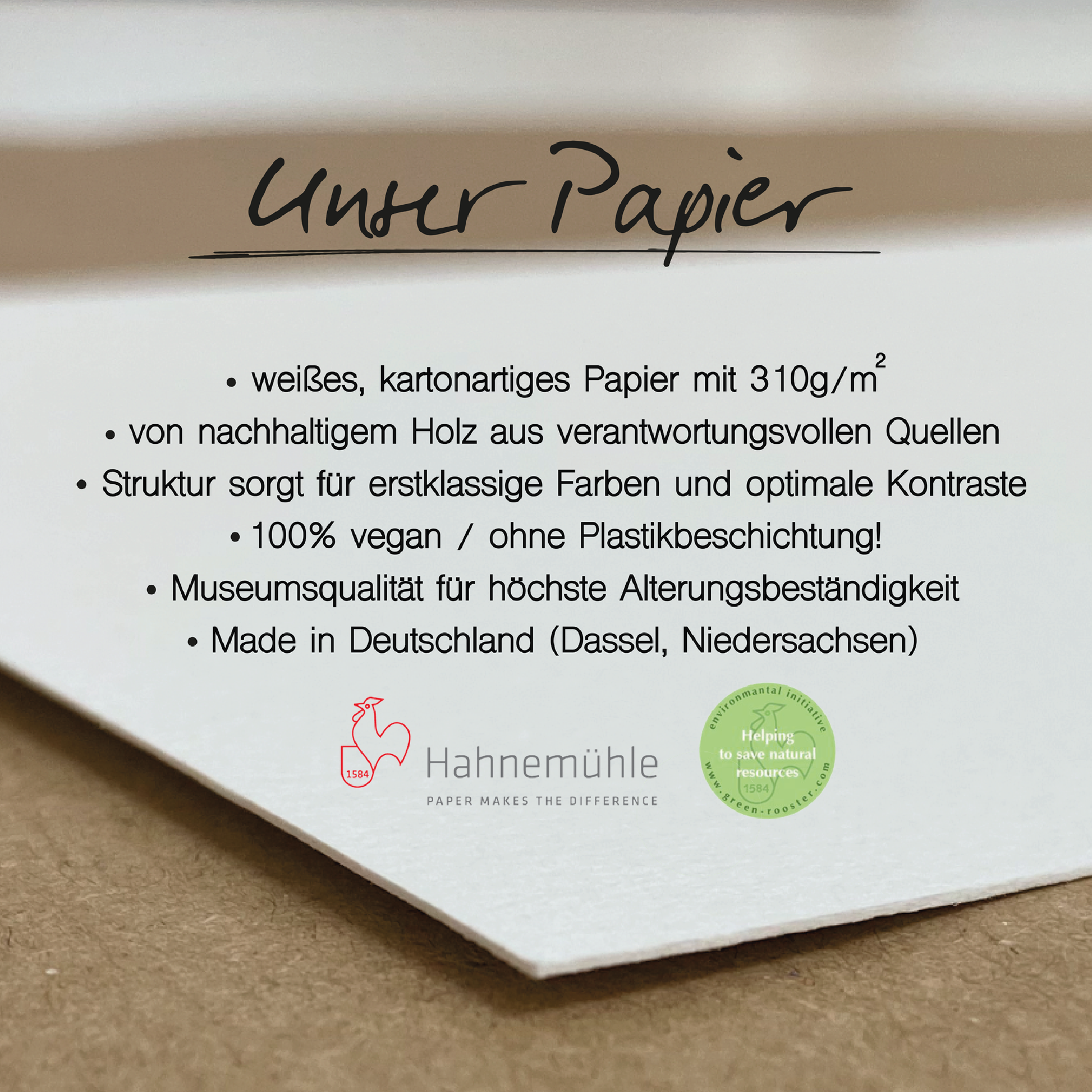 Der Druck erfolgt auf hochwertigem, in Deutschland produziertem, Papier der Firma Hahnemühle. Das weiße, 310g kartonartige Künstlerpapier, sorgt für eine enorme Bildtiefe mit präzisen Kontrasten und verfügt über keinerlei Plastikbeschichtung. Zudem ist es vegan. Wir grenzen uns damit deutlich von einfachen Poster-Drucken ab. Du erhältst hier einen Kunstdruck, der Dich sehr begeistern wird.