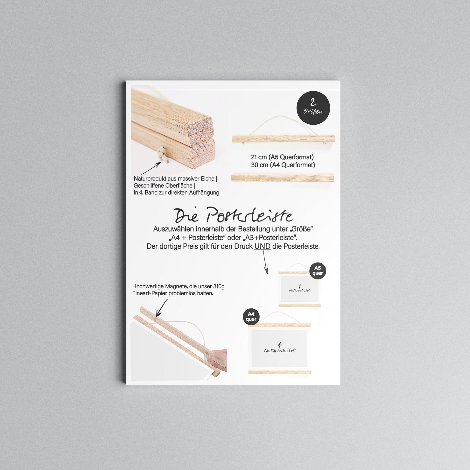Grundsätzlich ist bei einem Druck kein Rahmen/Posterleiste dabei. Mit unseren hochwertigen A4-Massivholzrahmen (schwarz gedeckt, weiß gedeckt, Eiche natur), die aus nachhaltigem, FSC-zertifizierten Holz in Deutschland produziert werden, hast Du die Möglichkeit, das Produkt als All-in-One-Lösung zu kaufen! Gleiches gilt für unsere hochwertige Posterleiste aus massivem Eichenholz. Wähle dazu bei der Bestellung z.B. "A4+ Rahmen schwarz" oder "A4 + Posterleiste" aus.