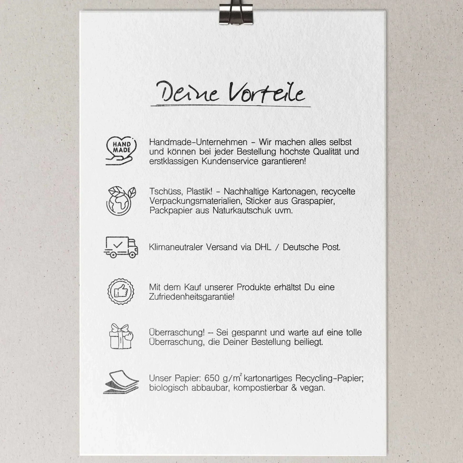Deine Bestellung geht direkt an die/den Beschenkte(n)? Kein Problem! Wir verwenden ausschließlich nachhaltige, stabile Verpackungsmaterialien aus Recycling-Papier oder Naturmaterialien und legen jeder Bestellung eine tolle Überraschung bei.